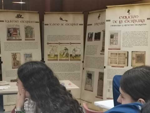 Este año, los alumnos comenzaron la jornada con una bienvenida y presentación del CSIC, y más especificamente, del CCHS, con su correspondiente explicación de la estructura y organización de los seis institutos de investigación que forman el centro. A continuación, comenzó la 1ª parte de la visita consistente en dos actividades: la primera fué la charla: Acompaña al primer embajador del Reino de Castilla en su viaje a Constantinopla y Samarkanda. La expedición de Ruy González de Clavijo a la corte del sultán Tamerlán (1403-1406), por Raúl Estangüi, Carmen García Bueno y Alfredo Calahorra. Esta charla se apoyó en un gran mapa y varios murales representando el viaje de Ruy Clavijo. Estuvo muy interesante ya que los ponenetes se centraron en los viajes y las expediciones de aquella época y consiguieron la atención de los alumnos convirtiendoles en "exploradores" por un rato. Despues del viaje de Calvijo, asistieron al taller Escrituras en la Península ibérica medieval, por Elvira Martín Contreras (ILC-CSIC) e Inés Calderón Medina (IH-CSIC). Tuvieron la ocasión de disfrutar de la escritura medieval escribiendo cada uno sus nombres con plumilla y tinta en papel especiales simulando a aquella época.